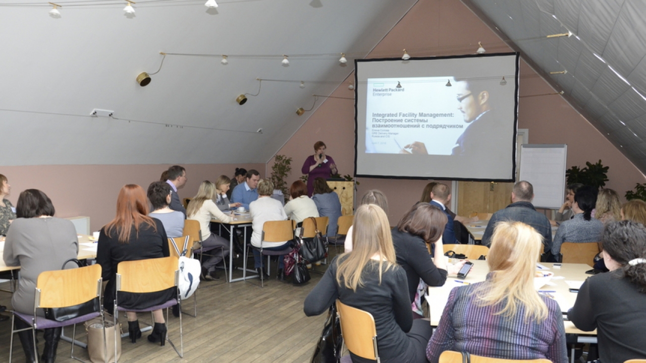 Елена Сопова – руководитель отдела по обслуживанию офисов в России и СНГ компании «Hewlett Packard Enterprise» рассказала участникам о том, как строится работа с поставщиками, предоставляющими услуги по управлению и обслуживанию офисов в компании Hewlett Packard Enterprise.